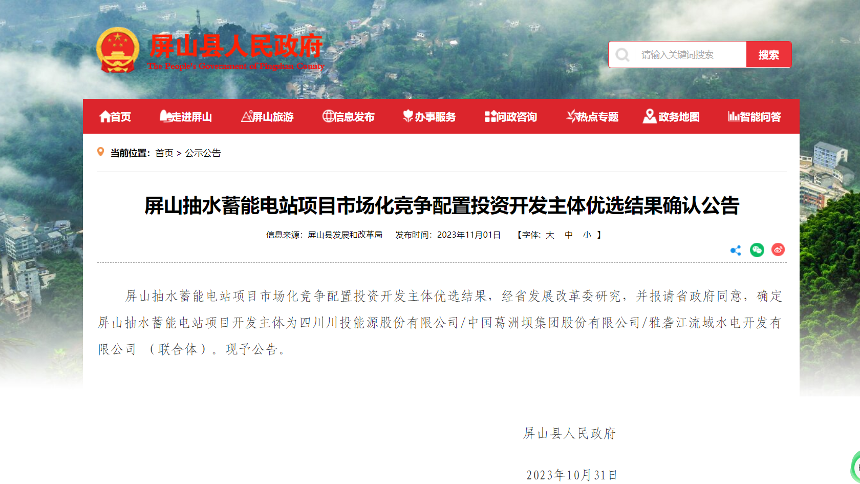 11月1日,宜賓市屏山縣人民政府發(fā)布《屏山抽水蓄能電站項(xiàng)目市場(chǎng)化競(jìng)爭(zhēng)配置投資開(kāi)發(fā)主體優(yōu)選結(jié)果確認(rèn)公告》,四川川投能源股份有限公司、雅礱江流域水電開(kāi)發(fā)有限公司、中國(guó)葛洲壩集團(tuán)股份有限公司組成的聯(lián)合體成功中標(biāo)。該項(xiàng)目是川投能源貫徹習(xí)近平總書記來(lái)川視察重要指示精神,以高質(zhì)量主題教育成效推動(dòng)企業(yè)高質(zhì)量發(fā)展的新成果,是深入貫徹落實(shí)省委十二屆三次全會(huì)精神,加力推進(jìn)新型工業(yè)化的新體現(xiàn),是推進(jìn)“五區(qū)共興”的新?lián)?dāng),是落實(shí)川投集團(tuán)“1+3”產(chǎn)業(yè)發(fā)展戰(zhàn)略的新作為,實(shí)現(xiàn)了在抽水蓄能領(lǐng)域、自主開(kāi)發(fā)百萬(wàn)千瓦級(jí)電站領(lǐng)域“雙破題”!