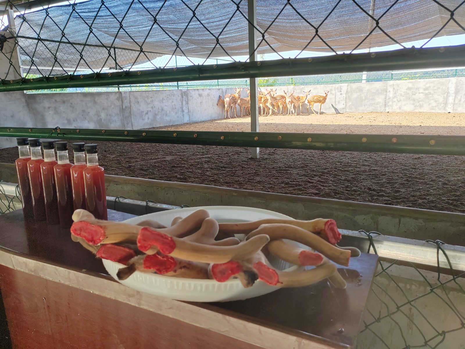 當(dāng)天上午,插旗山村梅花鹿養(yǎng)殖基地圍滿了前來(lái)的村民,在技術(shù)人員的專業(yè)指導(dǎo)下,飼養(yǎng)員們規(guī)范操作,伴隨著鹿茸鋸清脆的“咔嚓”聲,一對(duì)對(duì)形如珊瑚、色澤鮮亮的鹿茸應(yīng)聲而落,順利完成了首批6只梅花鹿的鹿茸收割。