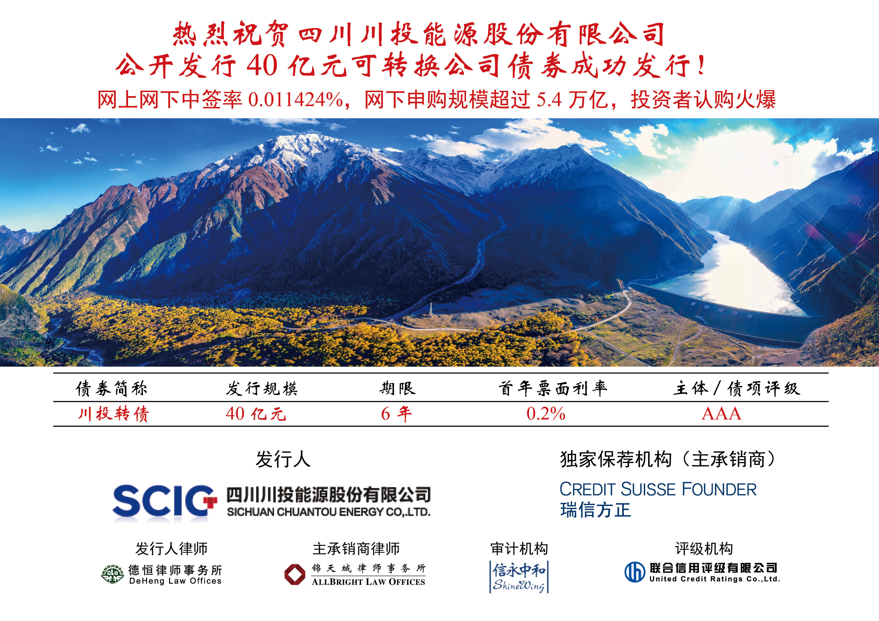 2019年11月15日,四川省投資集團(tuán)有限責(zé)任公司(簡稱“川投集團(tuán)”)控股四川川投能源股份有限公司(簡稱“川投能源”,600674.SH)公開發(fā)行A股40億元可轉(zhuǎn)換公司債券工作取得圓滿成功!40億元募集資金已全額到賬!這不僅是川投能源歷史上規(guī)模最大的一次融資,更標(biāo)志著川投集團(tuán)控股的川投能源上市公司6年資本市場融資工作實(shí)現(xiàn)破冰。對于川投集團(tuán)和川投能源優(yōu)化融資債務(wù)結(jié)構(gòu),做優(yōu)做強(qiáng)做大能源主業(yè),以及促進(jìn)四川省國有企業(yè)借助資本市場實(shí)現(xiàn)高質(zhì)量發(fā)展意義重大!
