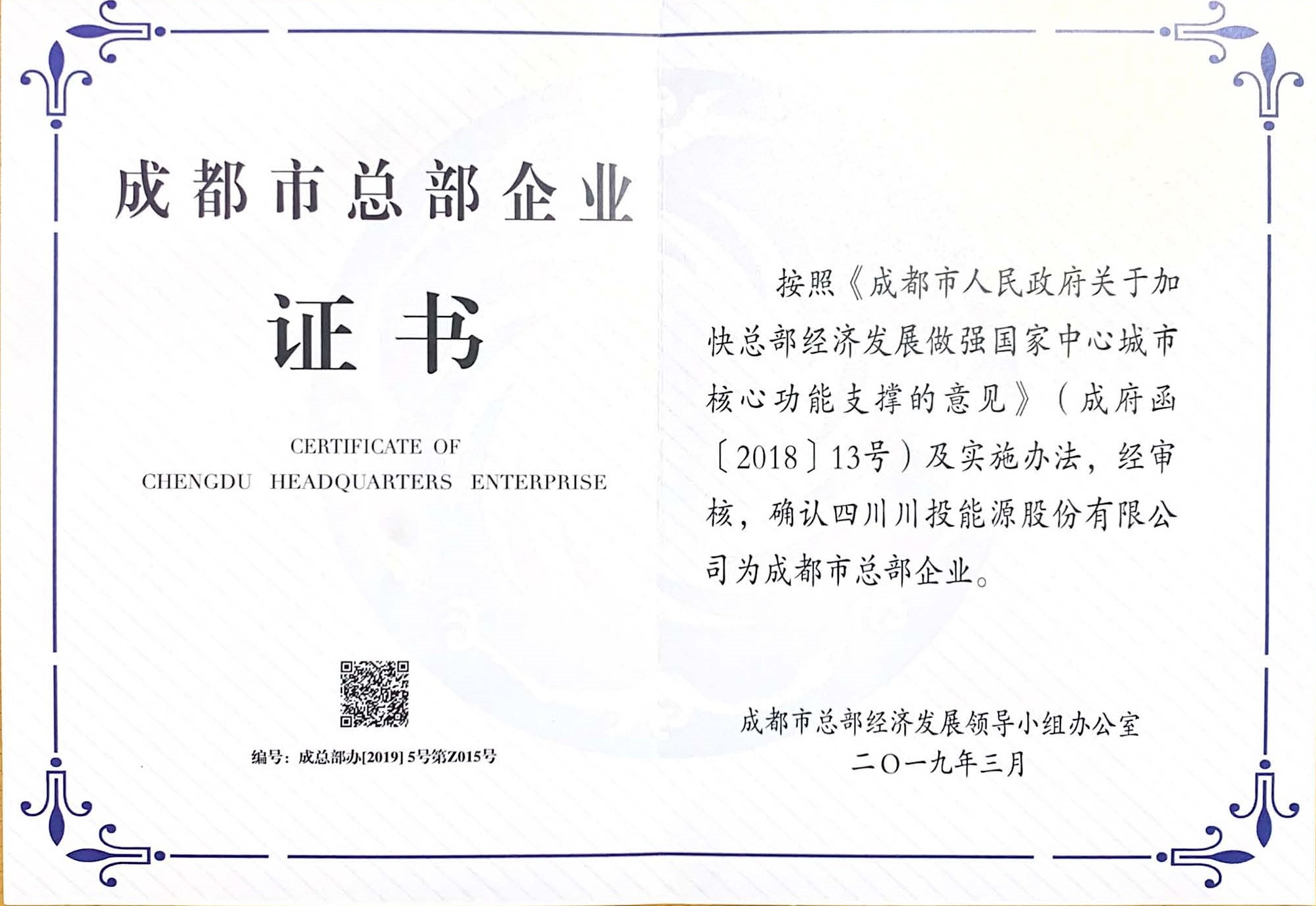 日前,從成都市總部經(jīng)濟(jì)發(fā)展領(lǐng)導(dǎo)小組辦公室處傳來(lái)喜訊,經(jīng)審核確認(rèn),川投能源正式通過(guò)2018年成都市第二批總部企業(yè)資質(zhì)認(rèn)證授牌,獲頒“成都市總部企業(yè)證書(shū)”,為2019年經(jīng)營(yíng)管理工作再添亮點(diǎn)。