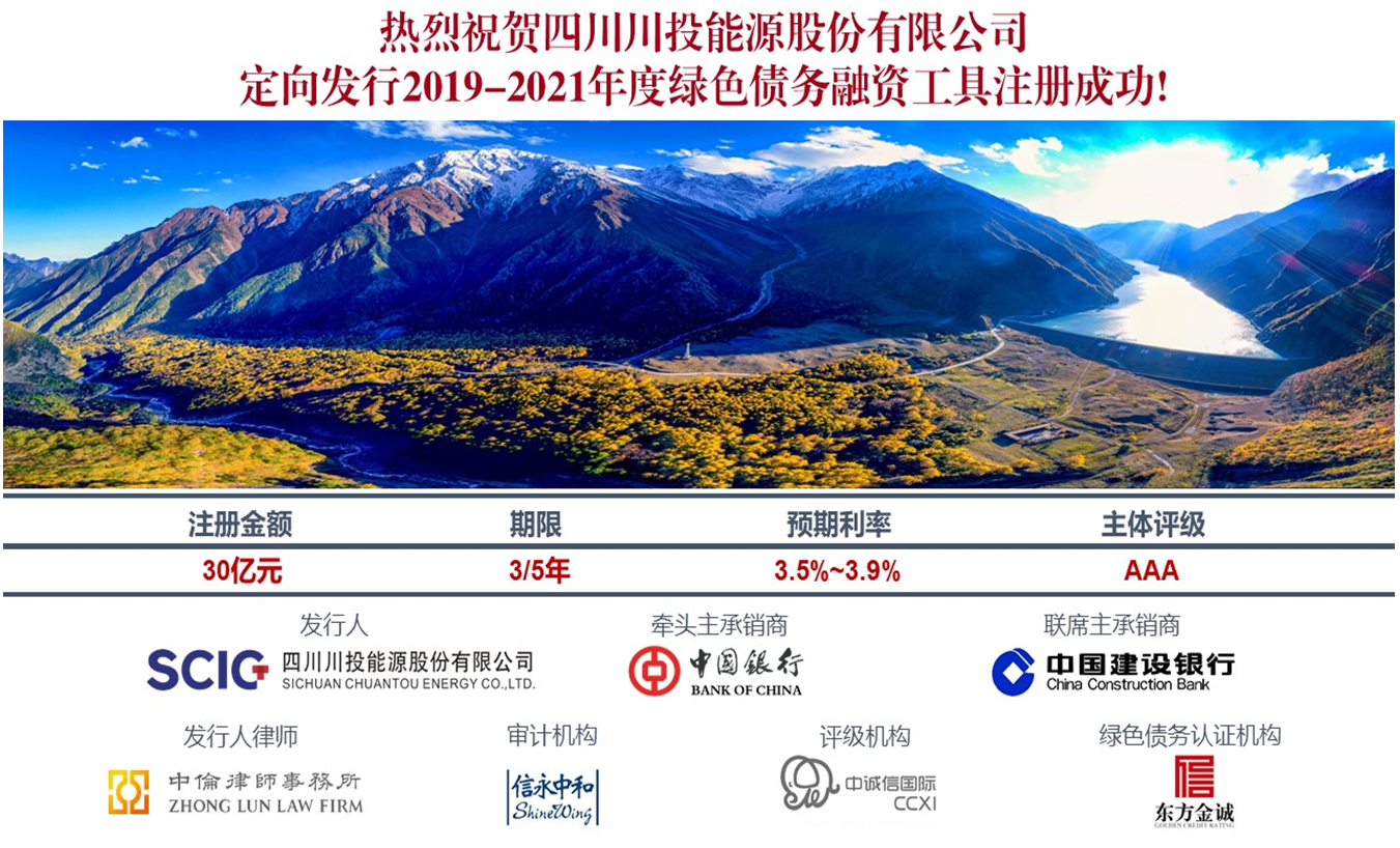 2月18日,川投能源迎來“定向發(fā)行2019-2021年度綠色債務(wù)融資工具”注冊成功的好消息。本次私募債注冊金額30億元,公司可在注冊額度內(nèi)分批次或一次性發(fā)行,募集資金將定向用于公司投資的綠色項(xiàng)目建設(shè),期限3/5年。此次為川投能源首次成功注冊私募債綠色債務(wù)融資工具,牽頭主承銷商為中國銀行。私募債發(fā)行利率將根據(jù)發(fā)行時的市場情況確定,預(yù)期在3.5%-3.9%之間(3-5年期限),遠(yuǎn)低于同期限銀行貸款基準(zhǔn)利率。