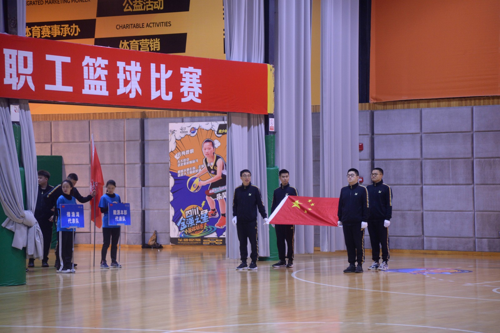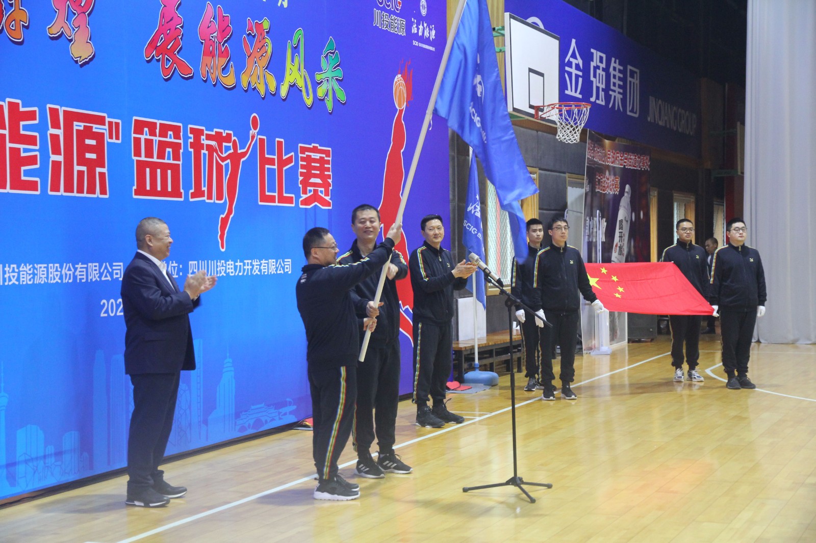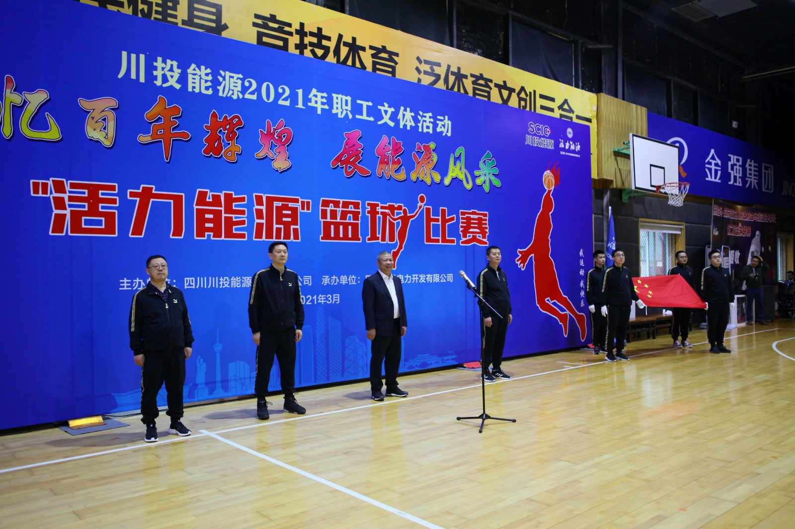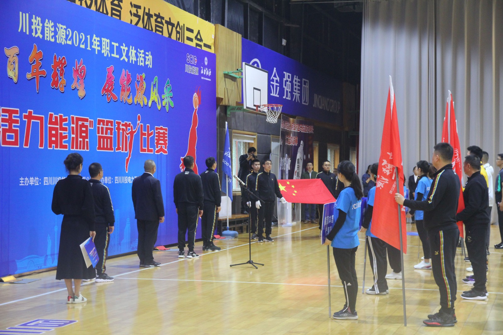 活動開始,伴隨著運動員進行曲,國旗方隊和參加隊伍依次進入會場。隨后舉行了莊嚴(yán)的升國旗、唱國歌儀式,運動員代表、裁判員代表先后宣誓。川投電力公司黨委書記、總經(jīng)理魏華代表此次籃球比賽的承辦方作簡要發(fā)言。