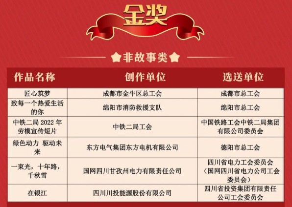 在熱烈慶祝黨的二十大勝利召開(kāi)之際,由四川省總工會(huì)主辦的本次大賽受到了各地市州、央企、國(guó)企的熱烈追捧,選送故事類(lèi)作品137部,非故事類(lèi)作品685部。經(jīng)過(guò)初評(píng)初評(píng),共有245部作品入圍終評(píng)。經(jīng)過(guò)專(zhuān)家評(píng)委的綜合評(píng)審,最終評(píng)選出故事類(lèi)、非故事類(lèi)作品金獎(jiǎng)各6部、銀獎(jiǎng)各8部、銅獎(jiǎng)各12部,優(yōu)秀獎(jiǎng)各25部??芍^百花齊放、精彩紛呈,競(jìng)爭(zhēng)十分激烈。