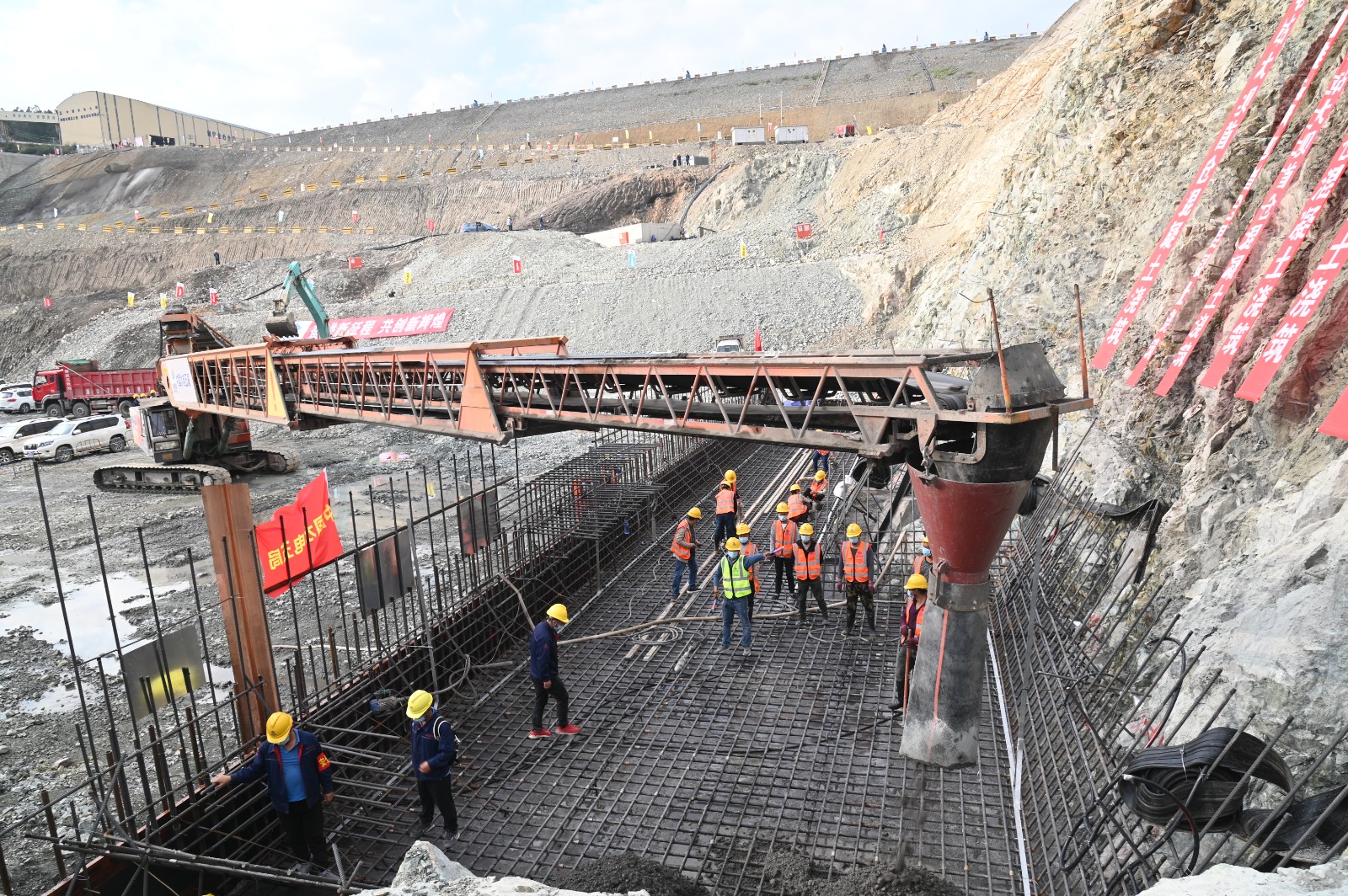 攀水電公司根據(jù)工程建設(shè)實(shí)際情況,于9月下旬及時(shí)制定了“決戰(zhàn)四季度、大干一百天,力爭提前完成二期基坑開挖,加快主體工程施工,獻(xiàn)禮二十大”活動(dòng)實(shí)施方案,成立了指揮部、6個(gè)工程推進(jìn)組和7個(gè)活動(dòng)保障組,組織召開了啟動(dòng)會(huì)。在活動(dòng)開展過程中,攀水電公司主要管理人員團(tuán)結(jié)帶領(lǐng)各參建單位,每日召開生產(chǎn)協(xié)調(diào)會(huì),黨員干部深入一線,及時(shí)解決現(xiàn)場問題,統(tǒng)籌組織施工資源,每日24小時(shí)不間斷進(jìn)行二期基坑開挖,截止目前二期基坑即將開挖完成,安裝場、1#~4#機(jī)組段、廠壩導(dǎo)墻及消力池等部位已開始混凝土澆筑,較合同計(jì)劃12月澆筑大壩首倉混凝土的目標(biāo)提前了30天。