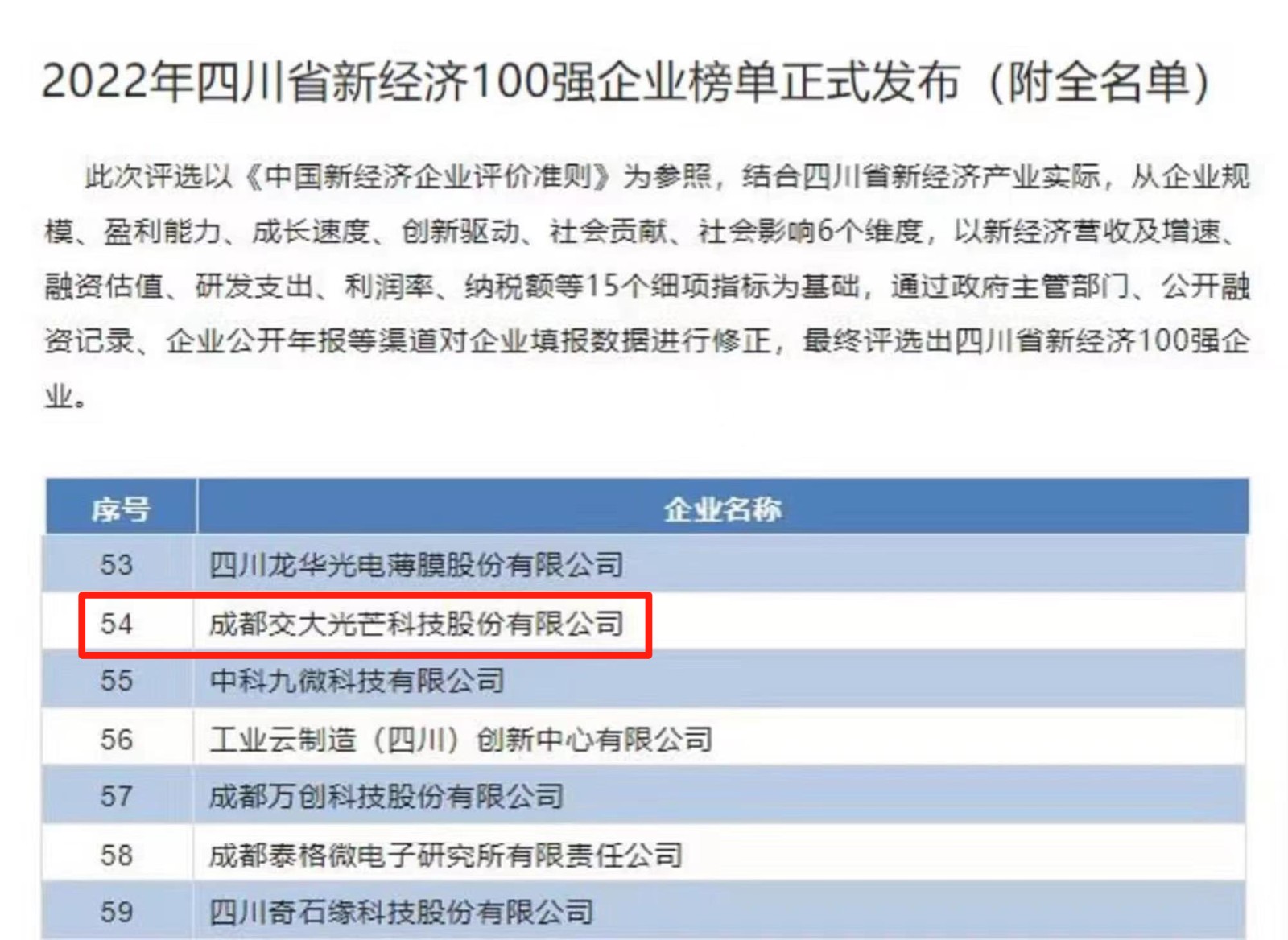 近日,四川省工業(yè)和信息化研究院發(fā)布“2022年四川省新經(jīng)濟100強企業(yè)榜單”,交大光芒成功獲評入圍,標志其位居四川省以新技術(shù)、新產(chǎn)業(yè)、新業(yè)態(tài)、新模式為特征的新經(jīng)濟企業(yè)的前列。
