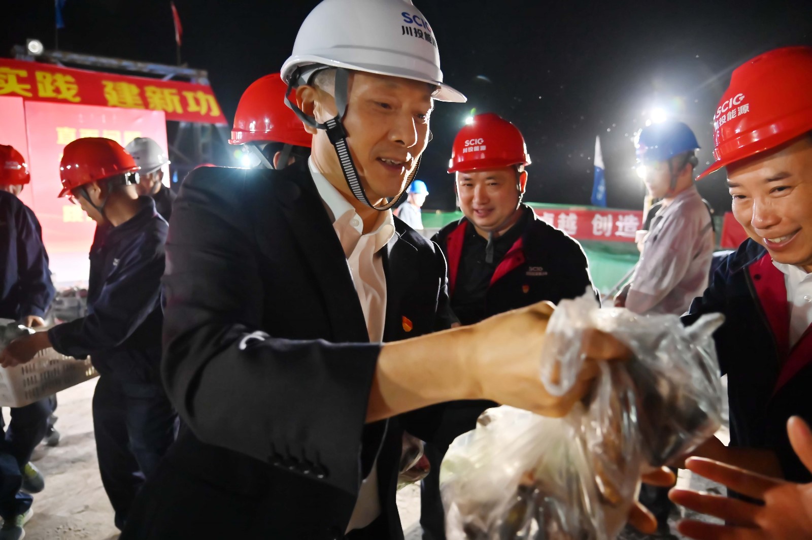 儀式開始前,受川投能源黨委書記、副董事長、總經(jīng)理楊洪委托,冉蘭平一行慰問了挑燈夜戰(zhàn)在銀江大橋的一線工友們,把熱乎乎的雞腿、粽子、咸鴨蛋、牛奶等送到一線人員的手中。