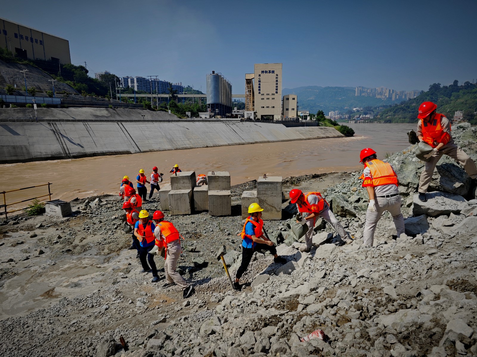 活動中,由公司黨員領(lǐng)導(dǎo)帶頭,分組對導(dǎo)流明渠邊坡、安全體驗館、上下游圍堰及基坑、導(dǎo)流明渠進出口等部位進行了全面詳細的巡視檢查?;顒舆€對防洪度汛應(yīng)急物資進行了補充,有的拿鐵鍬、有的拿編織袋,通過緊密配合,迅速完成幾百個防汛沙袋的裝袋,并排成長隊接力運送,將沙袋搬運至重點部位整齊堆放。通過半日的緊張勞動,參加人員衣背早已被汗水浸透,但他們沒有絲毫怨言,更是講到這次活動不僅補充了防汛物資,還真正提高了“防大汛、救大災(zāi)、搶大險”的安全意識和應(yīng)急搶險能力,將繼續(xù)堅守工作崗位,以汛為令、聞汛而動,在防洪度汛和應(yīng)急搶險中發(fā)揮先鋒模范作用,保障銀江水電站工程建設(shè)安全順利推進。