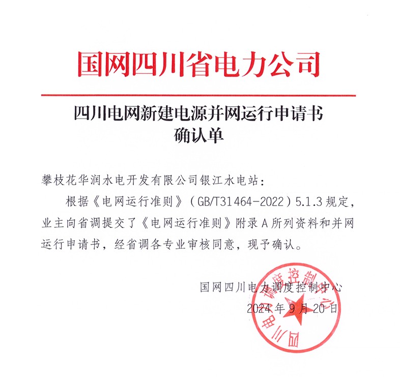 9月20日,在國網四川省電力公司和川投能源的指導幫助下,經過積極對接、多方協(xié)調,攀水電公司成功取得銀江水電站新建電源并網運行申請書確認單,標志著銀江水電站具備并網手續(xù)辦理的資格條件。