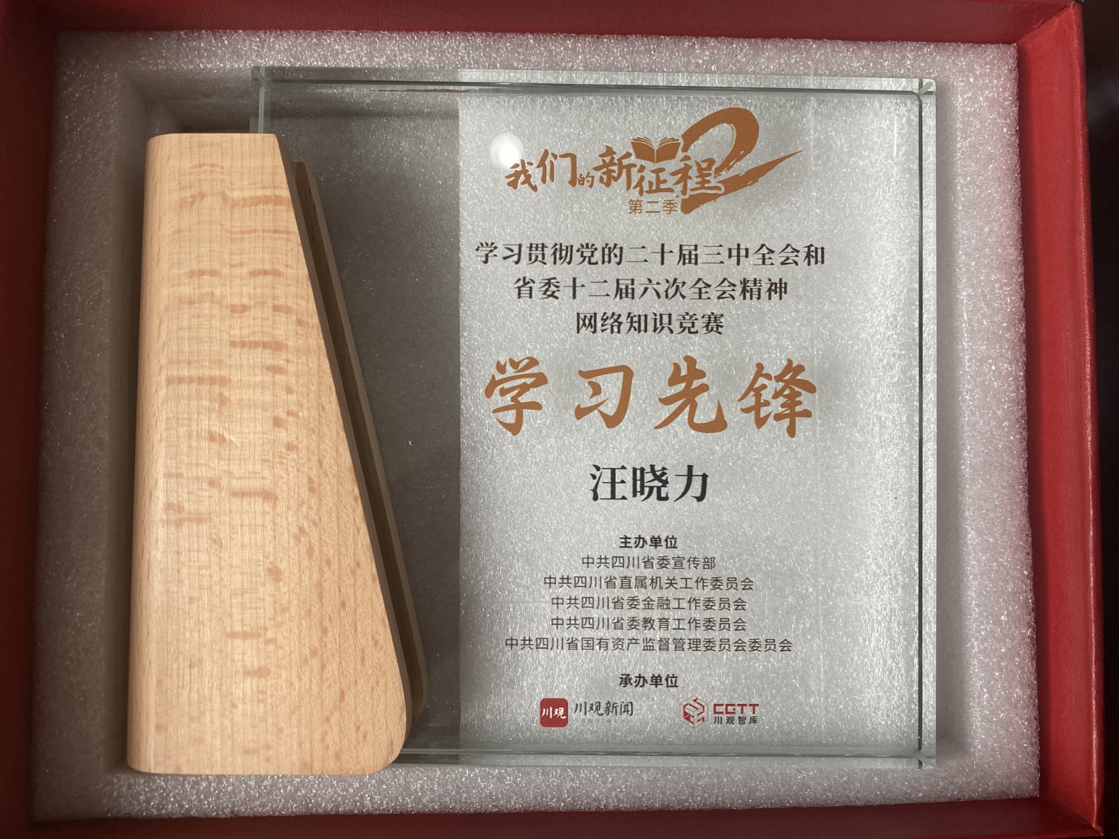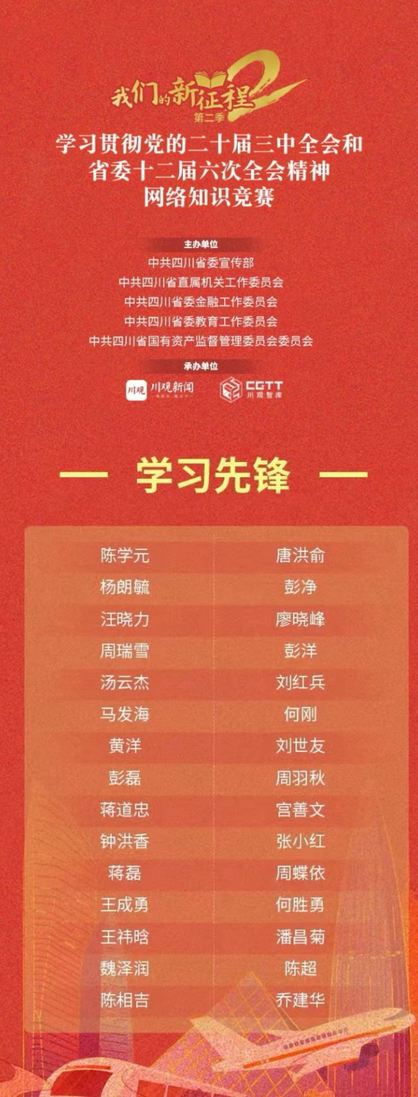 近日,由中共四川省委宣傳部、省委省直機關工委、省委金融工委、省委教育工委、省國資委黨委聯(lián)合主辦,四川日報報業(yè)集團承辦的“我們的新征程”(第二季)網絡知識競賽公布了獲獎名單,并為獲獎人員發(fā)放獎牌,川投電力所屬天彭電力11名員工憑借扎實的理論功底和鍥而不舍的努力,從全省32萬余名參與競賽的黨員群眾中脫穎而出,進入全省個人排行榜前30名,榮獲“學習先鋒”稱號。