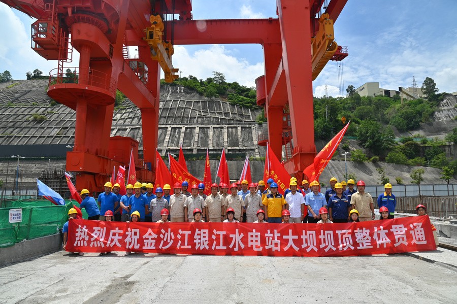 銀江水電站壩段工程結構復雜且布局有序,從左至右依次分布著左岸公路壩段、魚道壩段、安裝場壩段、機組壩段、河床溢流壩段、縱向圍堰壩段、右岸溢流壩段和右岸非溢流壩段,壩頂全長386.75米,最大壩高73米,壩頂高程1008米。大壩的建設歷時2年零8個月,2022年11月5日主體工程首倉混凝土開工澆筑,于2025年5月31日澆筑到頂,累計完成混凝土澆筑總量87萬立方米。在工程施工過程中,所屬攀水電公司與各參建單位一道,克服重重困難,構建起強有力的技術、管理、資源保障體系,推動工程建設各個關鍵節(jié)點目標均較計劃提前完成。