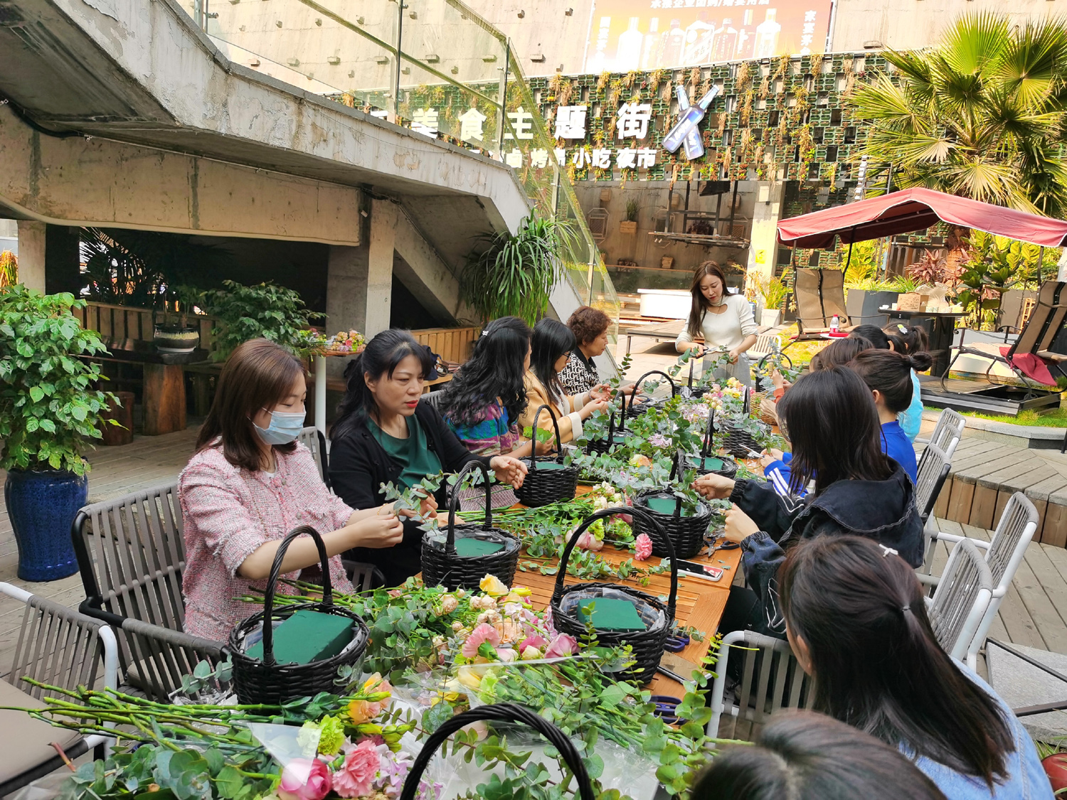 專業(yè)的花藝?yán)蠋煘榇蠹抑v授了鮮花的選花、色彩搭配、造型、保鮮方法和插花技巧,大家自己精心設(shè)計(jì)后,一盆盆細(xì)致精美的插花作品逐漸完工。